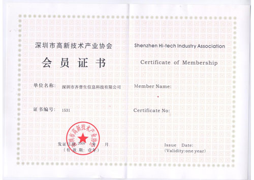 深圳市高新技術(shù)產(chǎn)業(yè)協(xié)會(huì)會(huì)員證書